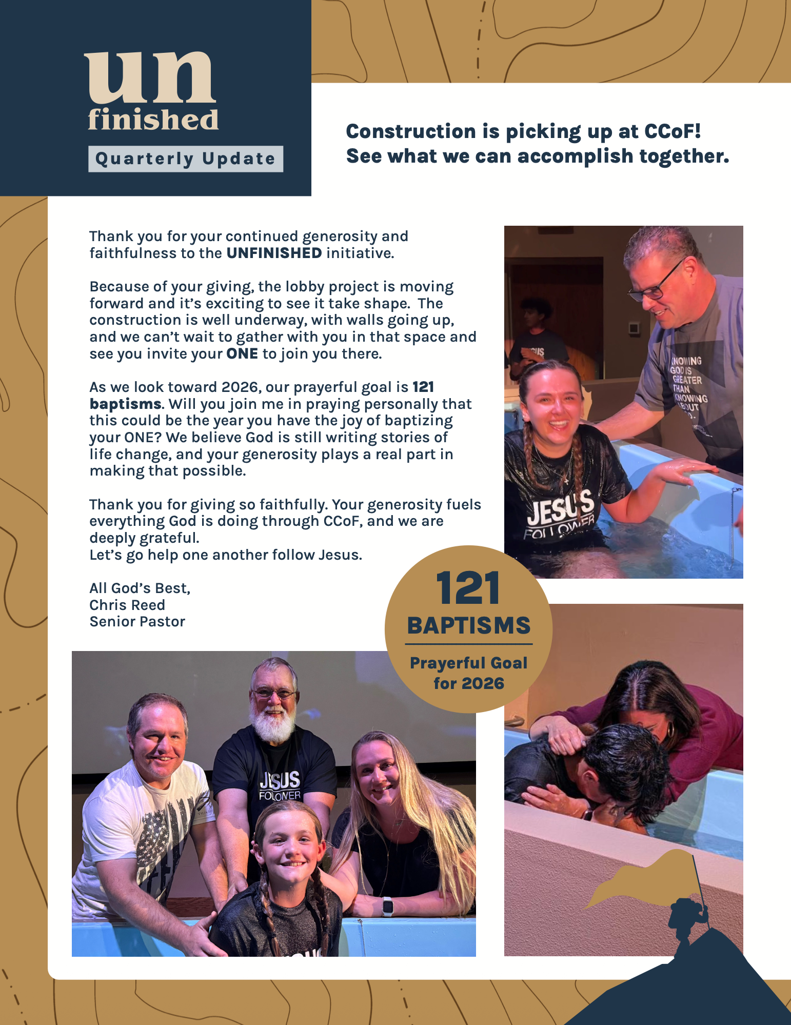 Regardless of where you are in your spiritual journey, we know God has more for you- we are all UNFINISHED. It is possible that the most life-changing, influential, and engaging days for you and your faith are still ahead. It is an amazing privilege to walk beside you as you continue to navigate your journey with Him.