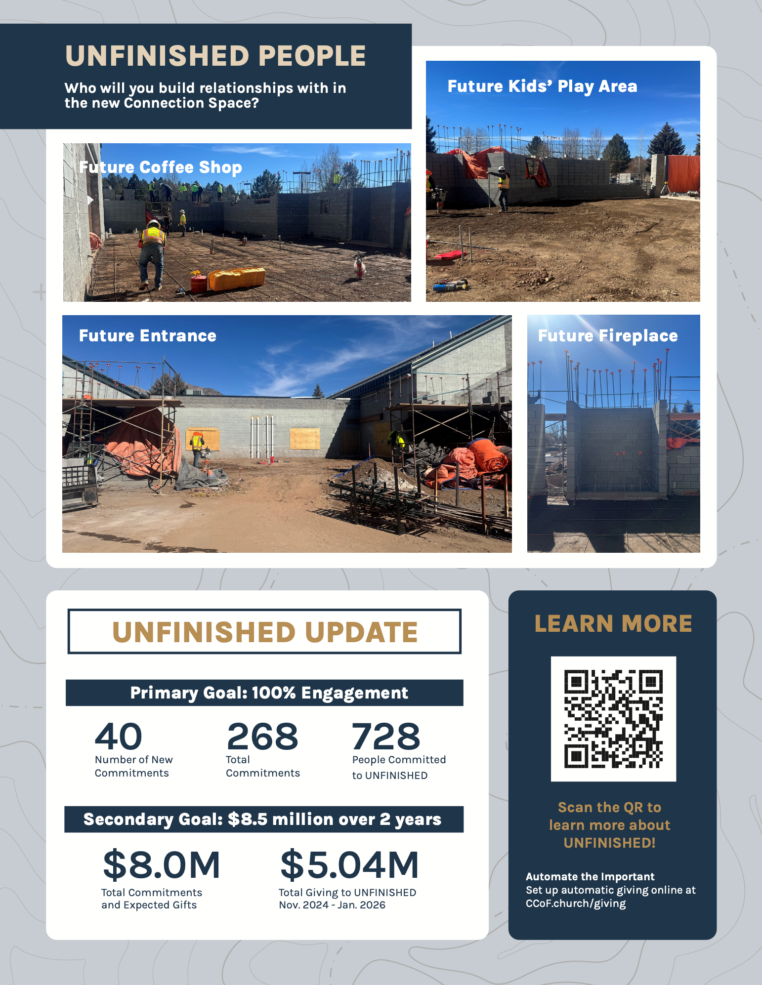 Every time our church family has sacrificed to create more space for others to connect with Jesus and His Family, God has filled that space! We look forward with great anticipation to what God will do in and through Christ’s Church as we seek to make an even greater impact on Northern Arizona, NAU, and the world. During this season, let’s explore together what God wants to do in UNFINISHED PEOPLE who are part of an UNFINISHED CHURCH on an UNFINISHED MISSION!
