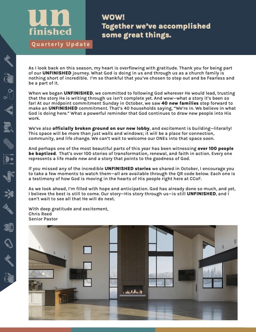 This year, as we celebrate 40 years of changed hearts and lives through Christ’s Church, our theme has been “For the One.” We are already seeing God moving in more and more hearts. Some of us have even had the privilege to baptize our Ones. We sense that God still has more to do in us and in our church, so we are prayerfully and humbly embarking on a two-year generosity initiative that we’re calling UNFINISHED.